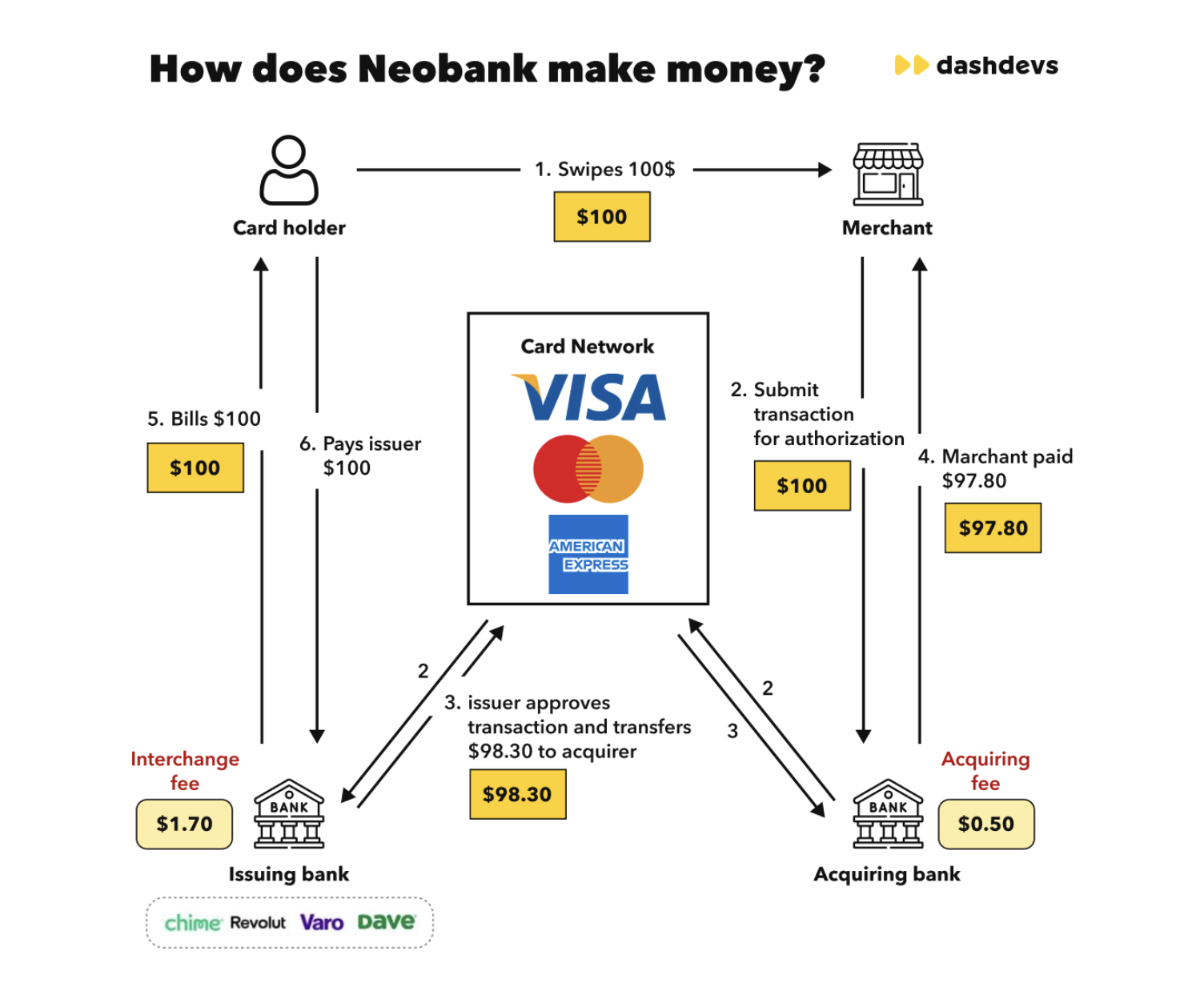#1 Interchange fee. A significant portion of a neobank’s revenue comes from the interchange fees paid by merchants when users use their debit cards to make purchases. Every time a Visa or Mastercard debit card is used to make a purchase, Visa adds a percentage fee to the total. In return, Visa sends a portion of the fees to a neobank.