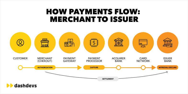When a customer enters their card details at checkout, the transaction moves through a structured chain: