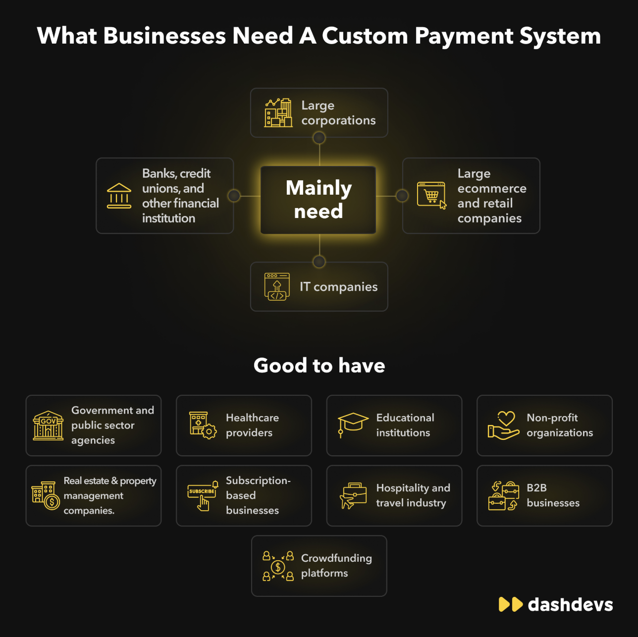 - Banks, credit unions, and other financial institutions. Being at the core of the financial world, these institutions have intricate and often unique transactional needs. A custom payment system can streamline internal financial processes, offer innovative services to their customers, integrate with other banking systems, and adhere to strict financial regulations and security standards.