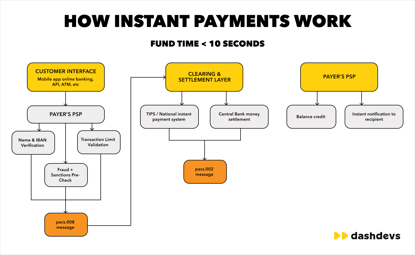 At DashDevs, we help banks, PSPs, and fintechs integrate instant payments without breaking compliance or uptime — from upgrading legacy SEPA cores to embedding Verification of Payee and real-time fraud monitoring into your stack.