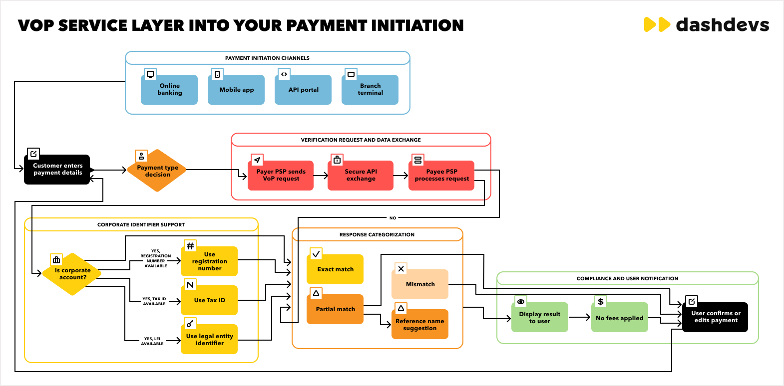 To comply with this requirement, you’ll need to integrate a VoP service layer into your payment initiation flow. Here’s what it may look like: